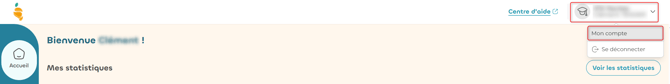 Pour ce faire, une fois connecté à la plateforme, cliquez sur le bouton en haut à droite qui indique l'établissement dont vous faites partie ainsi que votre prénom et nom, puis sélectionnez "Mon compte".