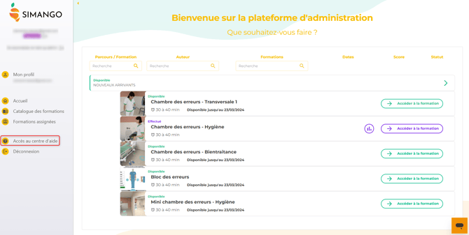 Afin de consulter la documentation me permettant de comprendre et de retrouver toutes les fonctionnalités disponibles, j'accède au centre d'aide Simango :