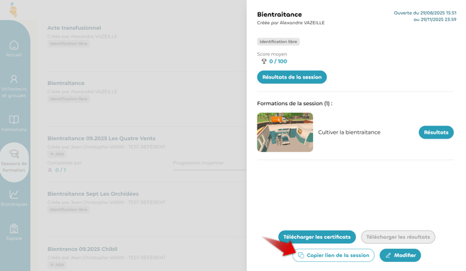 Pour ce faire, commencez par vous rendre sur la session de formation concernée, puis cliquez sur "Copier le lien de la session".