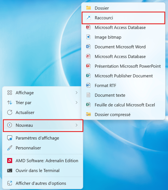 - Cliquez sur "Nouveau", puis sur "Raccourci"