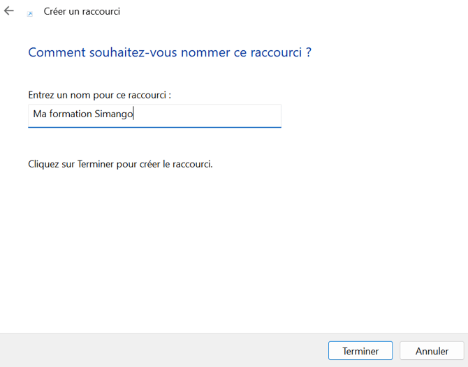 - Entrez le nom que vous souhaitez donner au raccourci, puis cliquez sur "Terminer"