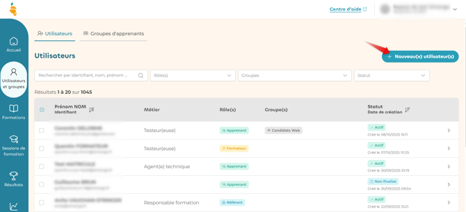 - Rendez-vous sur votre espace Simango, dans la rubrique "Utilisateurs et groupes", puis cliquez sur "Nouveau(x) utilisateur(s)"