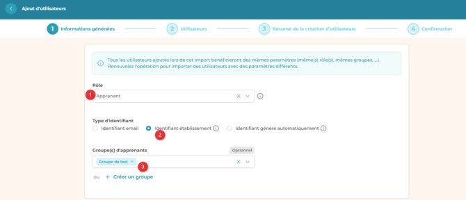 - Choisissez le rôle "Apprenant", cochez la case "Identifiant établissement" et sélectionnez le groupe où les apprenants seront ajoutés. .