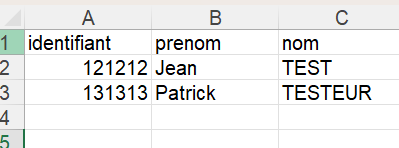 - Pour l'étape suivante, vous aurez besoin d'un fichier Excel avec exactement ces trois colonnes : identifiant, prenom, nom