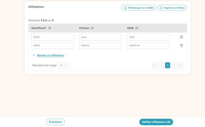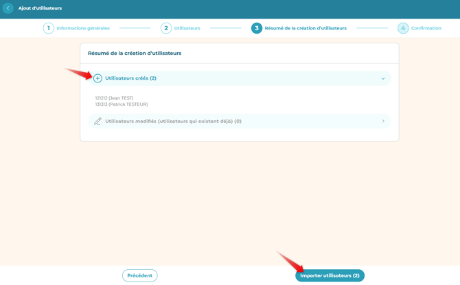 - Cliquez sur "Utilisateurs créés" pour afficher la liste des utilisateurs créés d'après les données de votre fichier Excel. Si les utilisateurs ne sont pas conformes, revenez à l'étape précédente et vérifiez les données que vous fournissez à la plateforme. Si tout est conforme, cliquez sur "Importer utilisateurs".