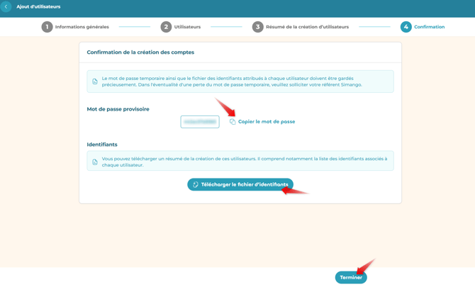 - Le dernier écran vous offre deux informations importantes. La première est le mot de passe par défaut pour tous les comptes que vous venez de créer. Cliquez sur "Copier le mot de passe" pour pouvoir le coller dans un mail ou dans votre communication à destination des apprenants. La seconde vous permet de télécharger un fichier contenant les matricules et noms de tous vos apprenants. Enfin, cliquez sur "Terminer" pour quitter la procédure.
